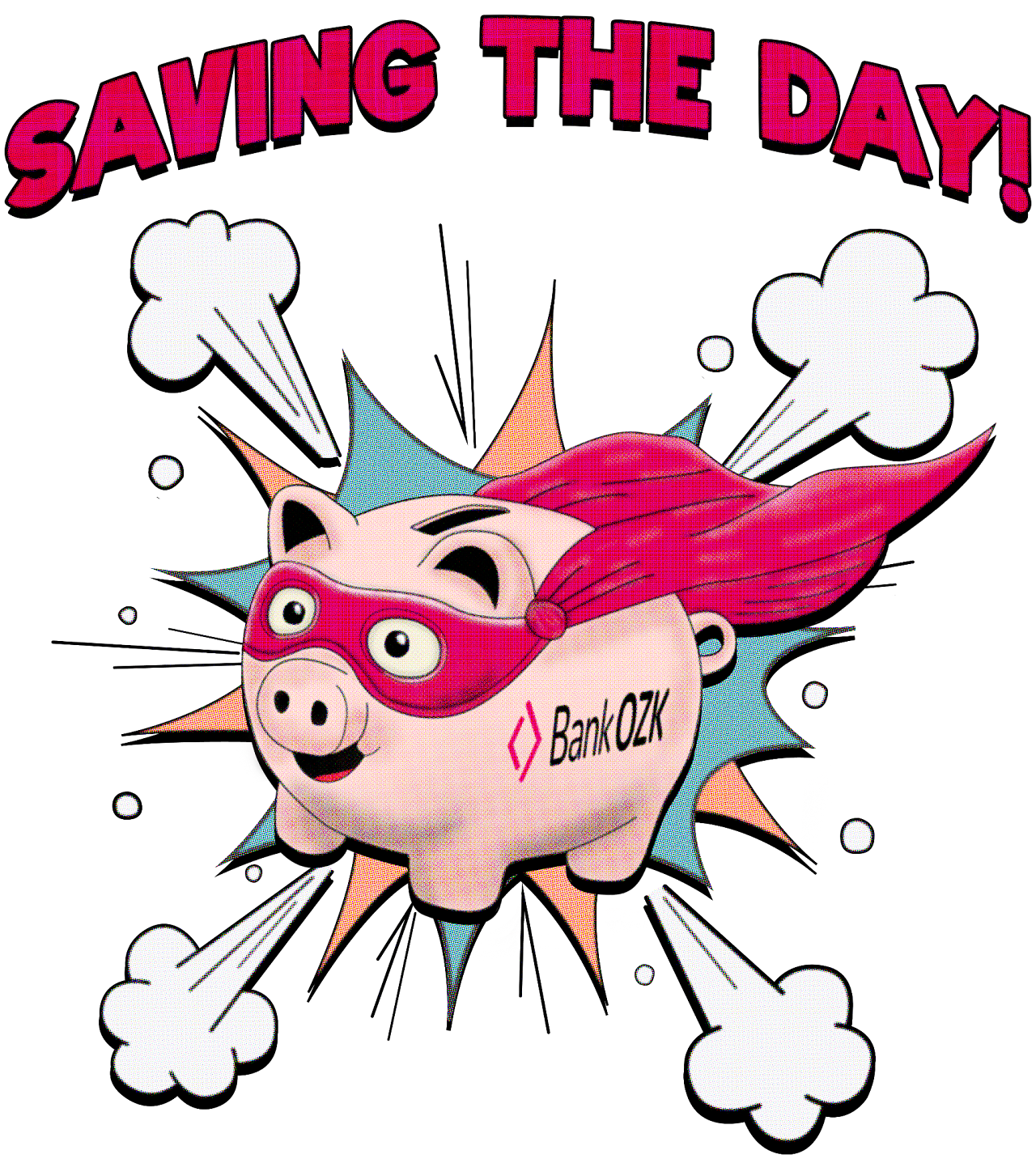 Created for a Bank OZK internal culture design contest. The goal was to empower saving by transforming a piggy bank into a comic book-style superhero, playing on the phrase “Save the Day.” Designed to encourage financial literacy through bold, visual storytelling. Concept not selected.